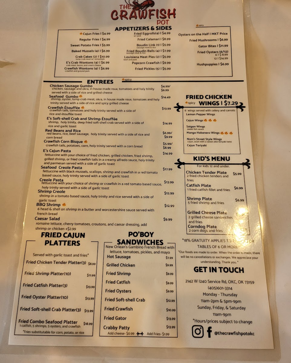 Welcome to The Crawfish Pot, a seafood gem nestled in Oklahoma City. This brand is known for its vibrant and flavorful menu that showcases the best of boil seafood. The offerings are extensive, from the tempting E's Shellfish Boil featuring a sumptuous mix of crawfish, jumbo gulf shrimp, king crab, and more, to the extravagant Fisherman Boil that takes your seafood feast to the next level with clams and a lobster tail.